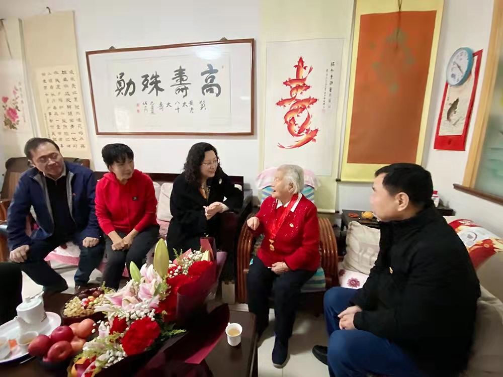 随后黄蓓一行来到元首集团离休老干部、老党员黄显和家中,送上鲜花和慰问金,致以佳节祝福,与黄显和老人座谈交流。93岁的黄显和老人年轻时在湖南读书期间就接受革命洗礼,秘密加入学校进步社团,在“白色恐怖”下开展爱国运动,转业后在济南针织厂辛勤耕耘近十八载,1982年4月离休,是名副其实的巾帼模范代表。黄蓓代表集团党委感谢她为党和企业做出的突出贡献,对其在革命年代的英勇事迹表示崇高敬意,表示产发集团要传承好老一辈不惧艰辛、敢于奋斗、无私奉献的精神,凝心聚力、接续奋斗。