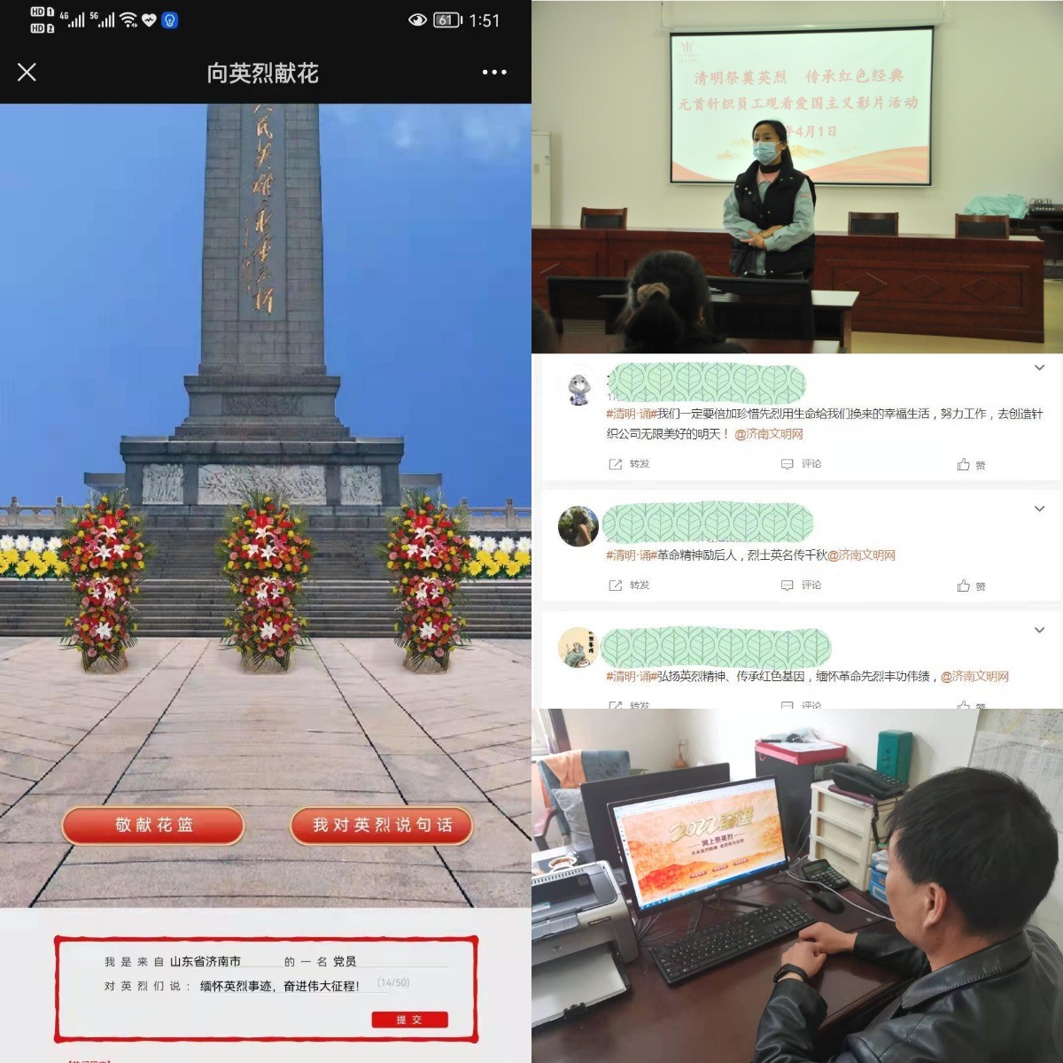 根据疫情防控相关措施要求,产发集团直属企业济粮集团、金德利集团、齐鲁化纤集团、元首集团、小鸭控股集团等,纷纷加入“网上祭奠英烈”活动,干部职工通过学习革命先烈的英雄事迹,观看抗战爱国电影,发表祭祀感言等形式,表达对英烈的感恩和敬仰,体验了一堂意义深远的爱国教育课。